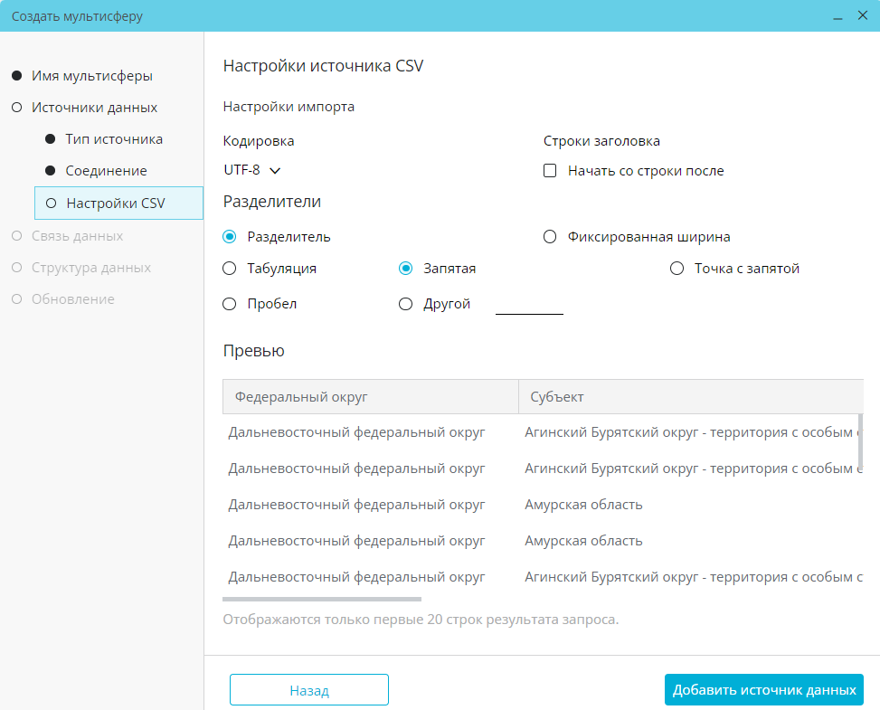 - Строка заголовка – укажите, является ли первая строка строкой заголовка;