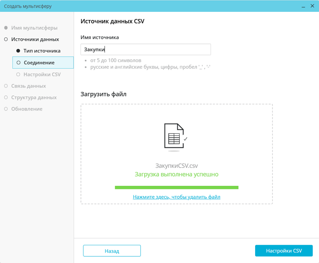 После выбора типа источника данных введите имя и укажите путь к файлу, кликнув на область Загрузить файл: