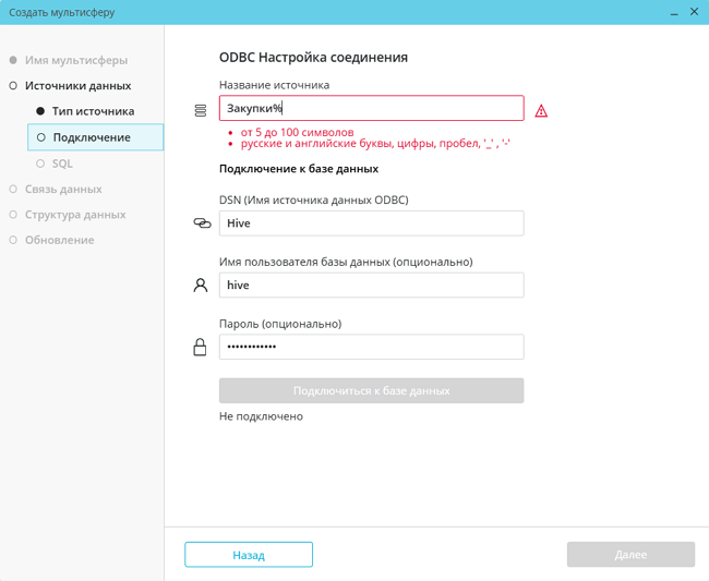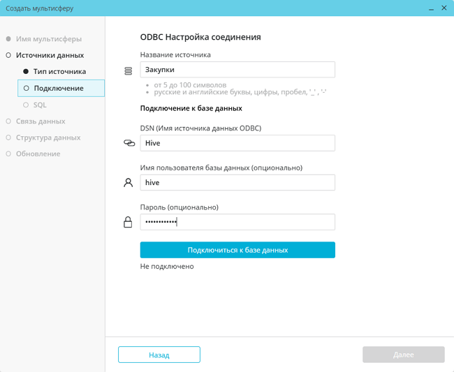Перед созданием или обновлением мультисферы убедитесь, что установлено подключение к Apache Hadoop Hive через ODBC. В случае отсутствия подключения обратитесь к системному администратору.