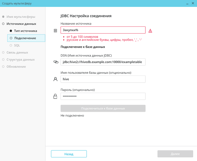 В случае ввода в поле «Название источника» запрещенных символов или ввода менее 5 символов контур поля и текст подсказки окрашиваются в красный цвет, а кнопка «Подключиться к базе данных» становится недоступной: