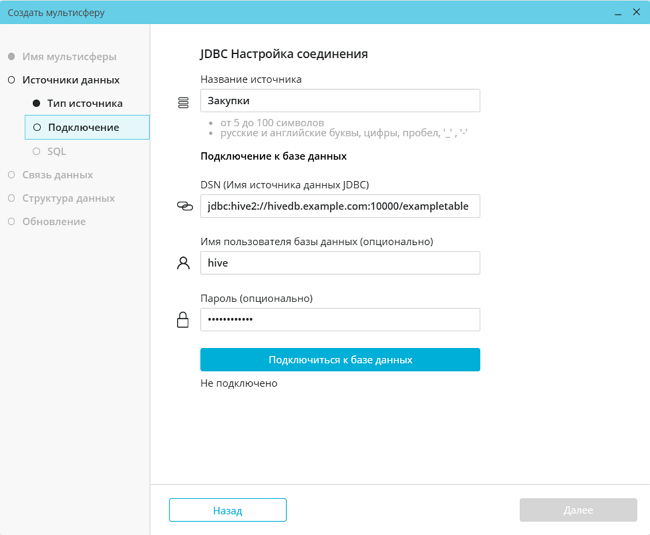 Polymatica Analytics поддерживает подключение через JDBC-драйвер к следующим базам данных: Hive, PostgreSQL, MS SQL, Teradata, MySQL, ClickHouse, Firebird, РЕД База Данных, Platform V Pangolin SE.