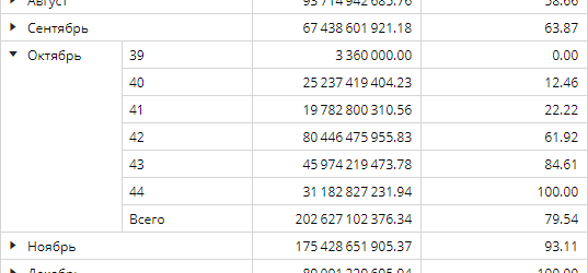 Рассмотрим пример, когда есть вложенные размерности. Если раскрыть элемент родительской размерности Дата месяц, то значение Всего для вложенных элементов будет соответствовать значению факта Копия 1 Конкурсы для элемента родительской размерности, когда он был свернут. Так, на рисунке ниже Всего для всех недель октября равно 79.54 от всего года, а вот факт ABC для вложенной размерности, Дата неделя, показывает значение нарастающего итога за каждую неделю месяца соответственно, от 0.00 до 100.00: