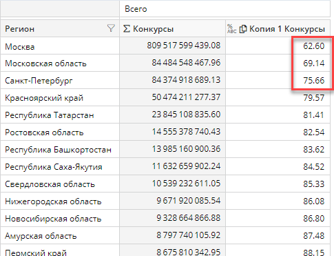 Рассмотрим другой пример. Предположим, мы понимаем, что какая-то часть элементов выборки составляет основную ее часть, на фоне которой процентная доля всех прочих элементов незначительна. Так, по сумме, выделяемой на проведение конкурсов, некоторые регионы России явно доминируют. Создадим копию факта Конкурсы, изменим вид факта на ABC и отсортируем столбец Конкурсы по убыванию. Это позволит нам увидеть, какую долю в процентах составляют лидеры рейтинга. Как видно из рисунка ниже, более 75% от суммы по всем проводимым конкурсам в России занимают всего три региона: Москва, Московская область и Санкт-Петербург: