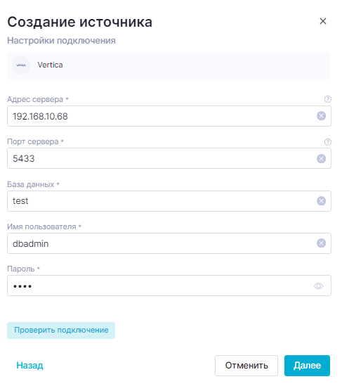 Настройки подключения источника Vertica