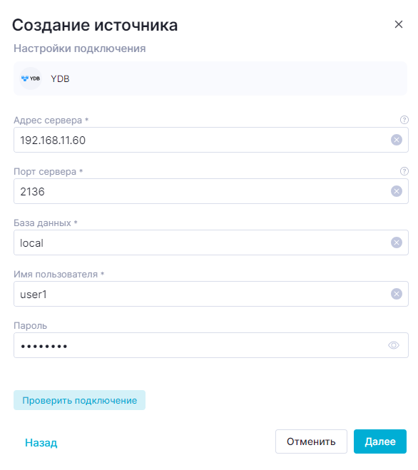 При выборе варианта YDB Server откроется окно настройки подключения источника: