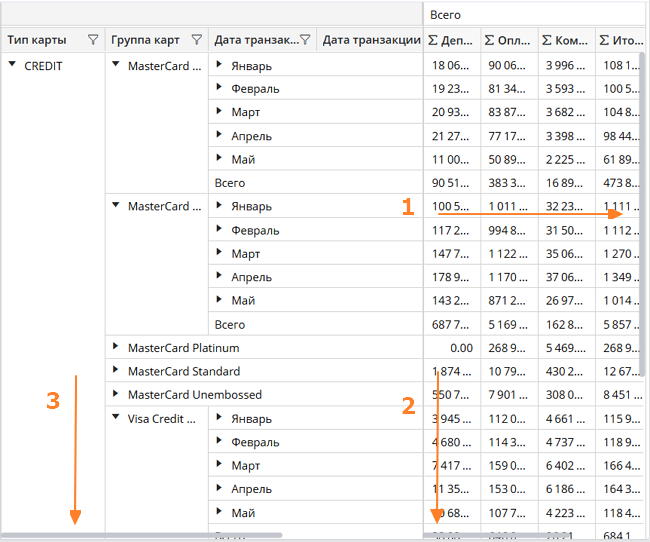 • Сворачивание и разворачивание элементов размерностей влияет на отображение выделенных ячеек в столбцах фактов. Поэтому рекомендуется сначала привести таблицу в требующийся вид, развернув/свернув все нужные элементы, и только после этого приступать к выделению ячеек со значениями фактов.
