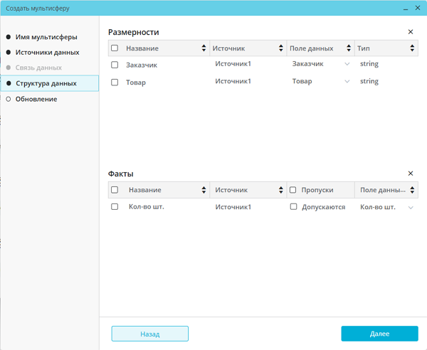 Вкладка «Связь данных» неактивна, если на вкладке «Источники данных» добавлен всего один источник. В таком случае при нажатии на кнопку «Далее» на вкладке «Источники данных» пользователь автоматически переходит на вкладку «Структура данных», пропуская шаг с заполнением вкладки «Связь данных»: