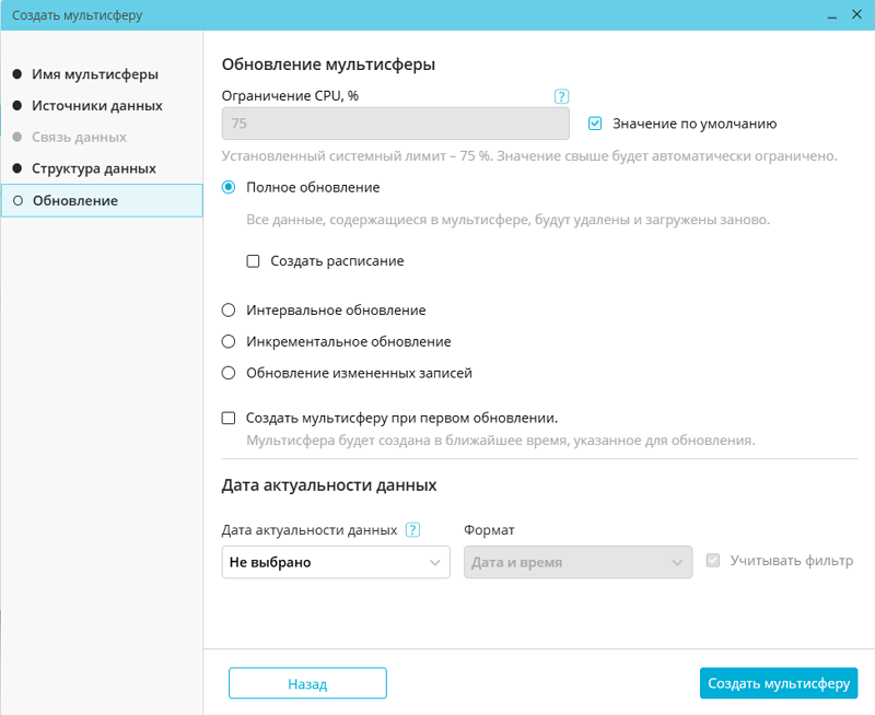 Для пользователей с ролью «Администратор системы» на вкладке «Обновление» окна создания и изменения мультисферы отображается поле «Ограничение CPU, %», в котором можно установить максимальный процент ресурсов CPU, которые будут использоваться при импорте во время создания и последующего обновления конкретной мультисферы: