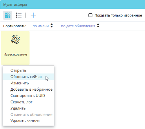 Для того, чтобы начать работать с новой структурой мультисферы, необходимо выполнить обновление мультисферы (выполним в рамках примера обновление вручную).