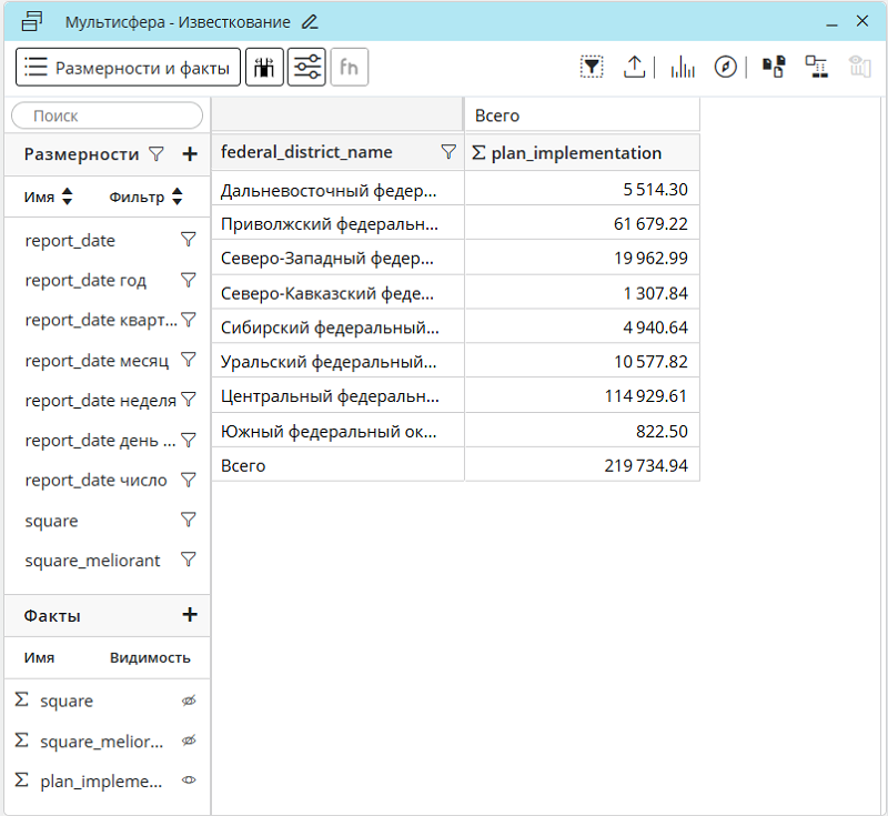 Предположим, в таблице «public.Известкование» добавилось поле (например, числовой показатель plan_implementation) и пользователю необходимо добавить его в мультисферу (в качестве факта). Для этого необходимо выполнить следующие шаги:
