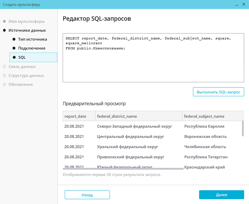 После выполнения запроса на вкладке «SQL» в режиме предварительного просмотра доступны первые 20 строк результата запроса, а на вкладке «Структура данных» видны все размерности и факты мультисферы: