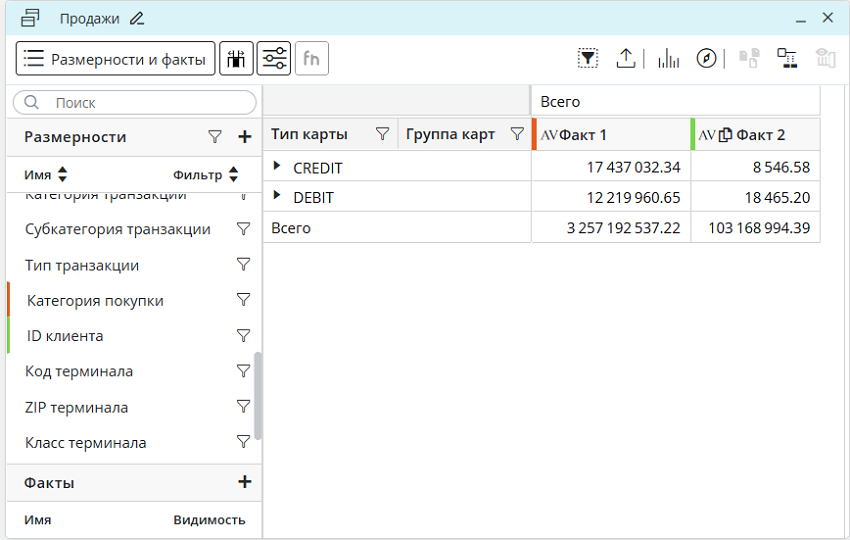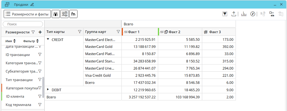Добавим к нашему исходному примеру с «Фактом 1» и «Фактом 2» еще один факт, «Факт 3». Установим для него вид «Количество» и расчет по уровню 1 (по умолчанию). Раскроем у размерности «Тип карты» элемент «CREDIT»: