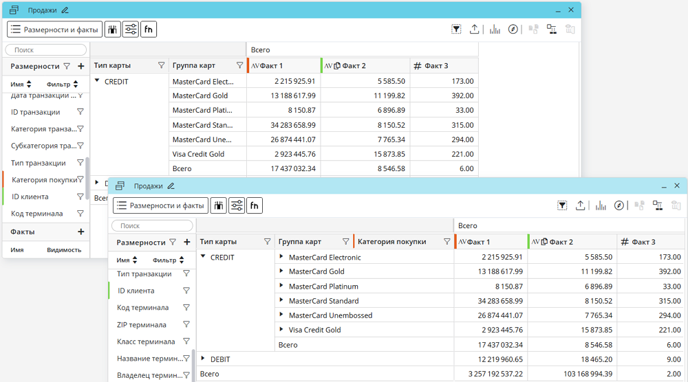 Если же вместо «Категории покупок» мы вынесем в рабочую область размерность «ID клиента», то порядок опорных размерностей изменится и значения для всех фактов пересчитаются. Первой вложенной размерностью для «Группы карт» станет размерность «ID клиента», и значения «Факта 3» для каждой группы кредитных карт будут отображать количество клиентов, оплативших покупки кредитными картами этой группы: