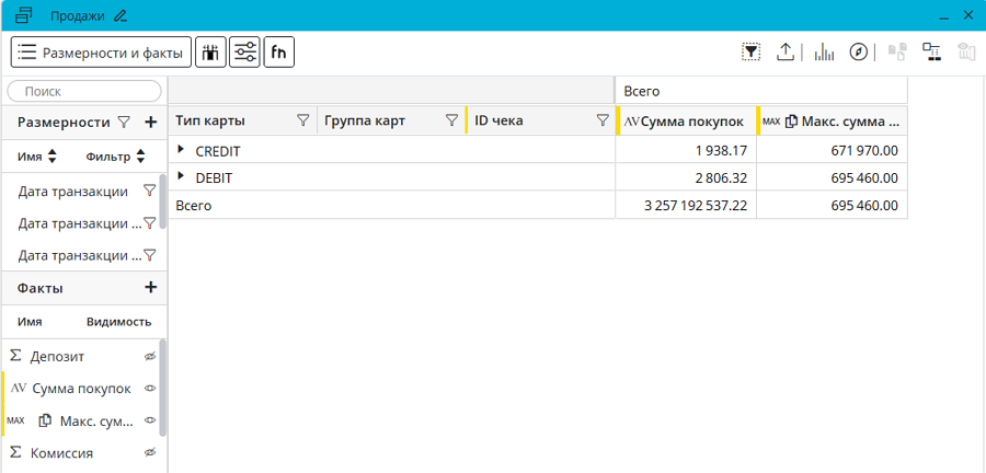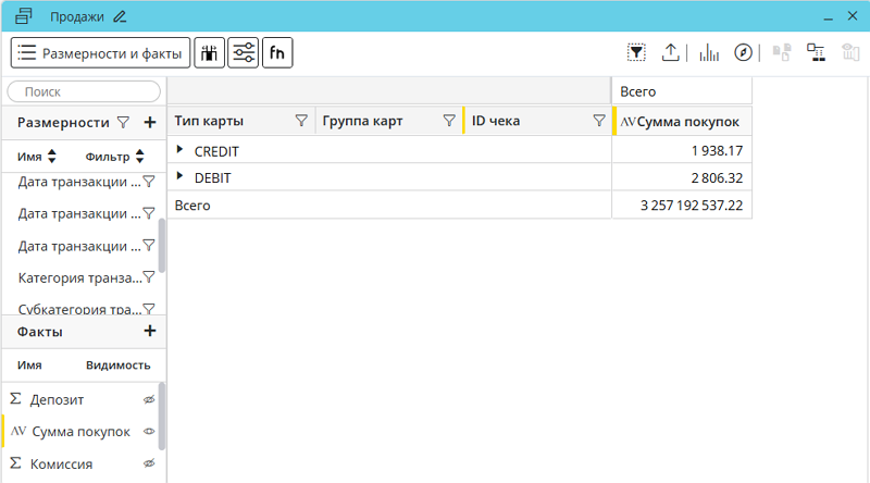 Теперь факт «Сумма покупок» рассчитывается по опорной размерности «ID чека», а в левой части поля с названием факта отображается индикатор в виде цветной вертикальной полосы. Такой же индикатор отображается и для выбранной размерности: