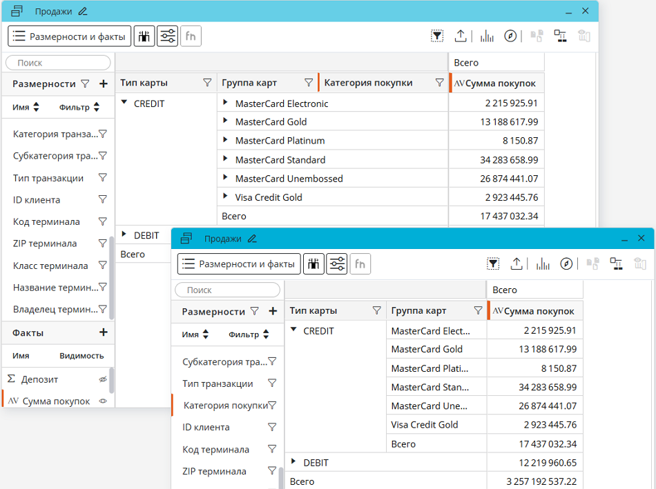Два окна мультисферы на рисунке ниже имеют практически одинаковую конфигурацию, но в первом окне опорная размерность «Категория покупки» находится в области данных, а во втором — на панели размерностей и фактов. Сравним значения факта в этих окнах:
