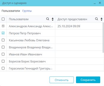 В окне «Доступ к сценарию» в столбце «Пользователи» отображаются только ФИО пользователей (или UUID пользователя, данные о ФИО которого отсутствуют в системе). Логины пользователей доступны только для администратора.