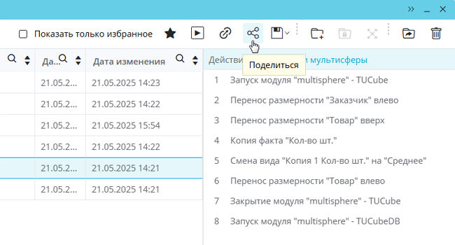 Чтобы сценарий был доступен другим пользователям, им можно поделиться. Для этого выделите сценарий в списке и нажмите на кнопку «Поделиться»: