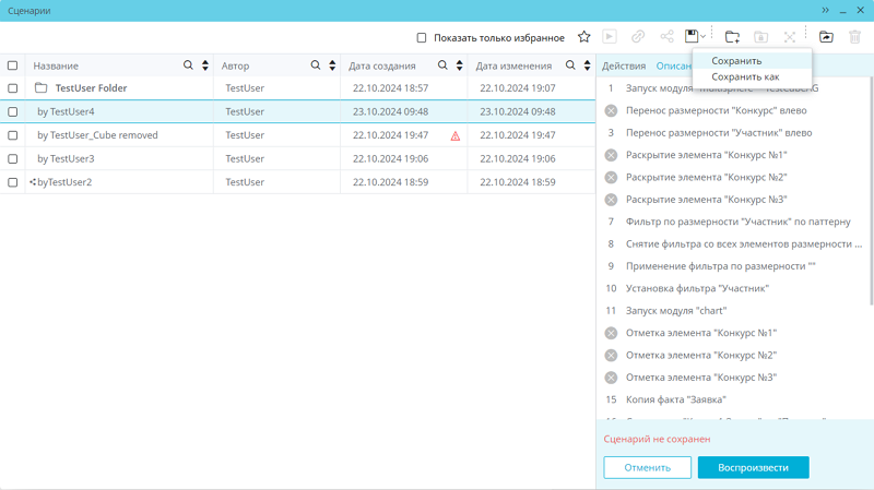 При нажатии на кнопку «Удалить» пользователю станет доступна кнопка «Воспроизвести», по которой будет воспроизведен сценарий с учетом удаленных шагов. Также можно сохранить сценарий с удаленными шагами в текущем, нажав «Сохранить» на панели управления.