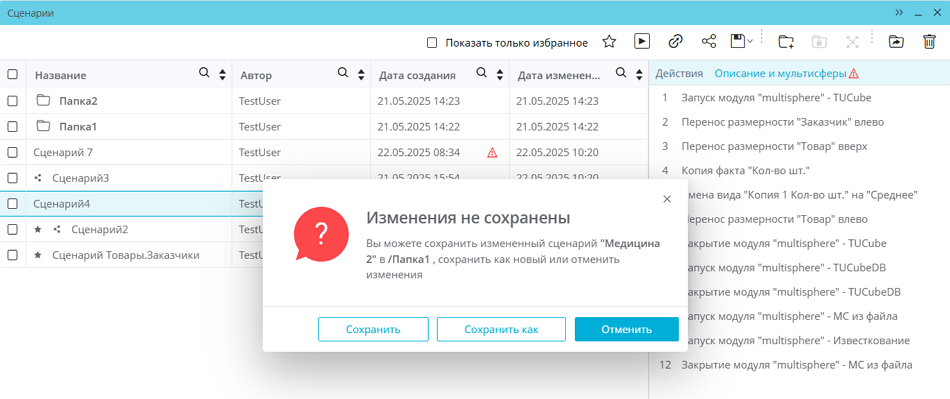 Если не сохранить сценарий после изменения и начать изменять другой сценарий, появится окно с предупреждением о том, что изменения в первом сценарии не сохранены:
