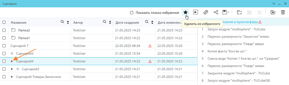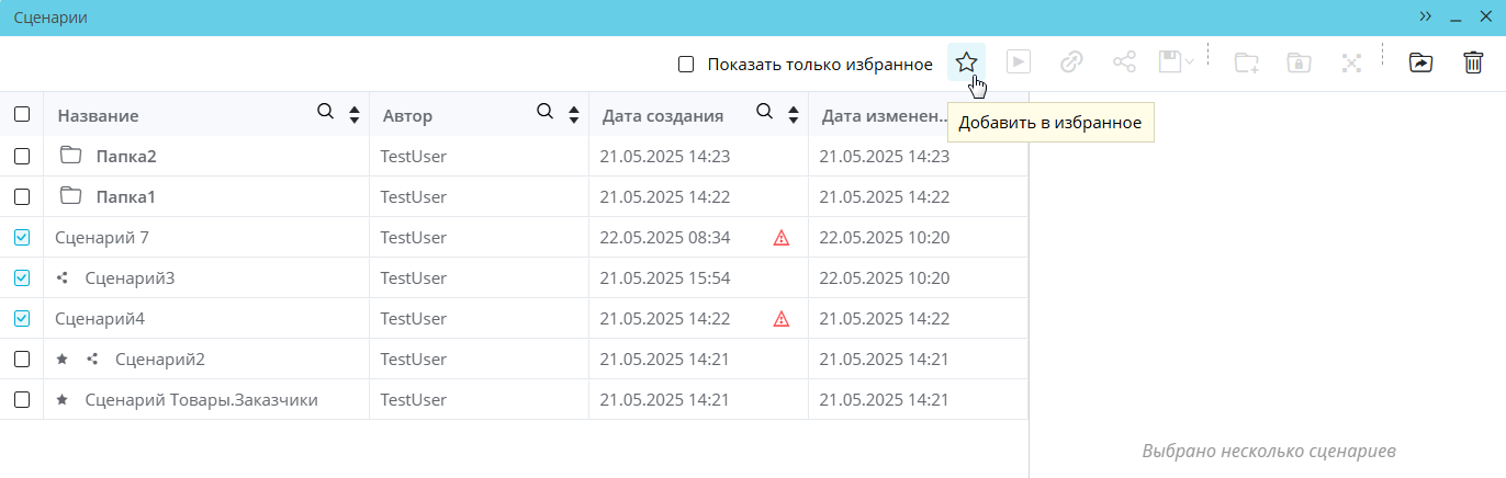 Для отображения исключительно избранных сценариев нужно отметить чекбокс «Показать только избранное» на панели управления в окне сценариев:
