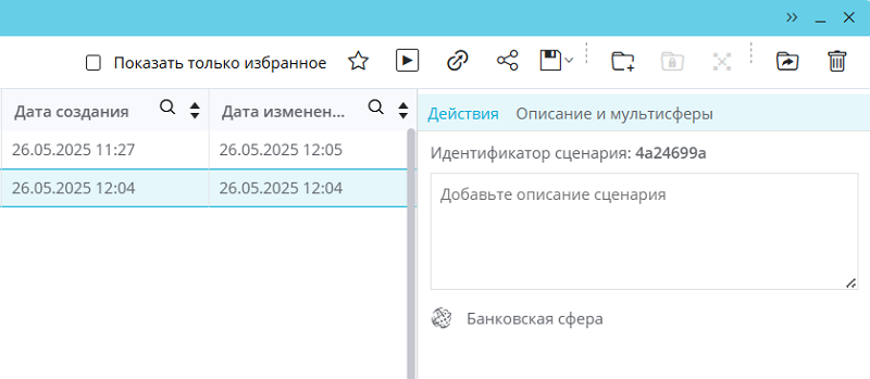 Вкладка «Описание и мультисферы» – содержит поле с описанием сценария, идентификатор сценария, а также список используемых в сценарии мультисфер.