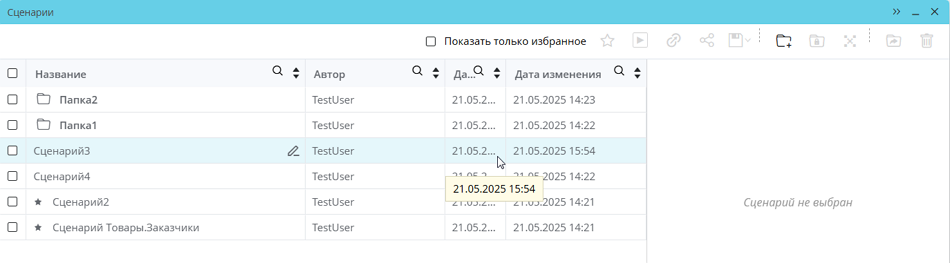 В таком режиме в списке отображаются все избранные сценарии, вне зависимости от того, в каких папках они находятся и какую папку открывает пользователь. При этом поиск осуществляется только по избранным сценариям. Отображаемые избранные сценарии можно сортировать, так же, как и при отображении полного списка.