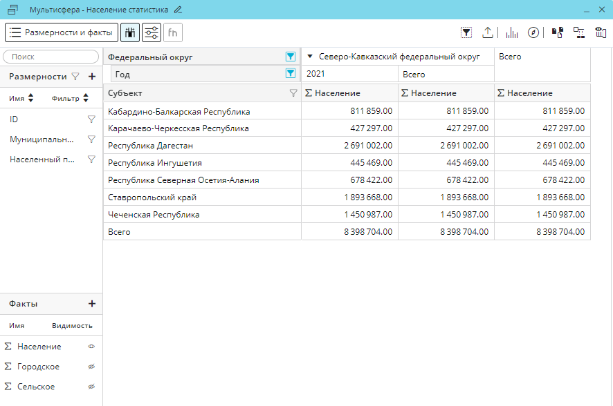 Воспроизведенный сценарий. В фильтры соответствующих размерностей переданы значения «Северо-Кавказский ФО» и «2021»