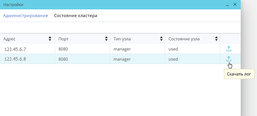 • Столбец с кнопками для скачивания логов. При нажатии на кнопку «Скачать лог» в строке одного из узлов выгружается файл с логом системных событий за текущий день для этого узла. Название файла состоит из названия логгера и текущей даты (пример: main_2025_07_25).