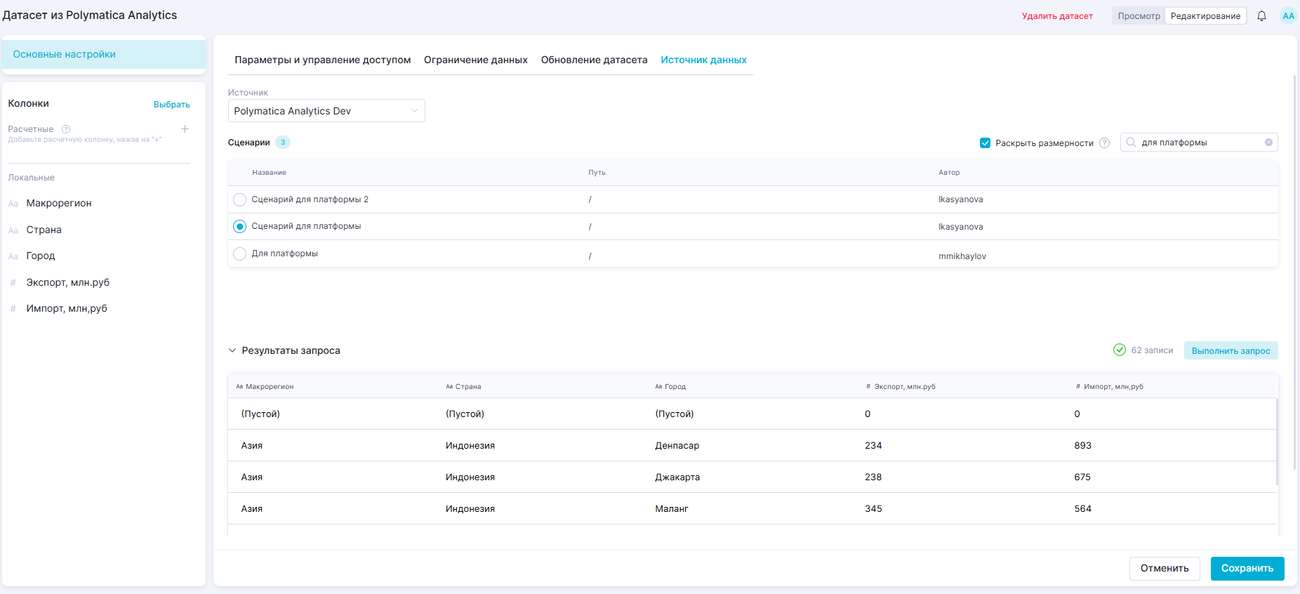 В настроек датасета из API Polymatica Analytics вкладка "Источник данных" позволяет заменить сценарий, на базе которого был создан датасет.