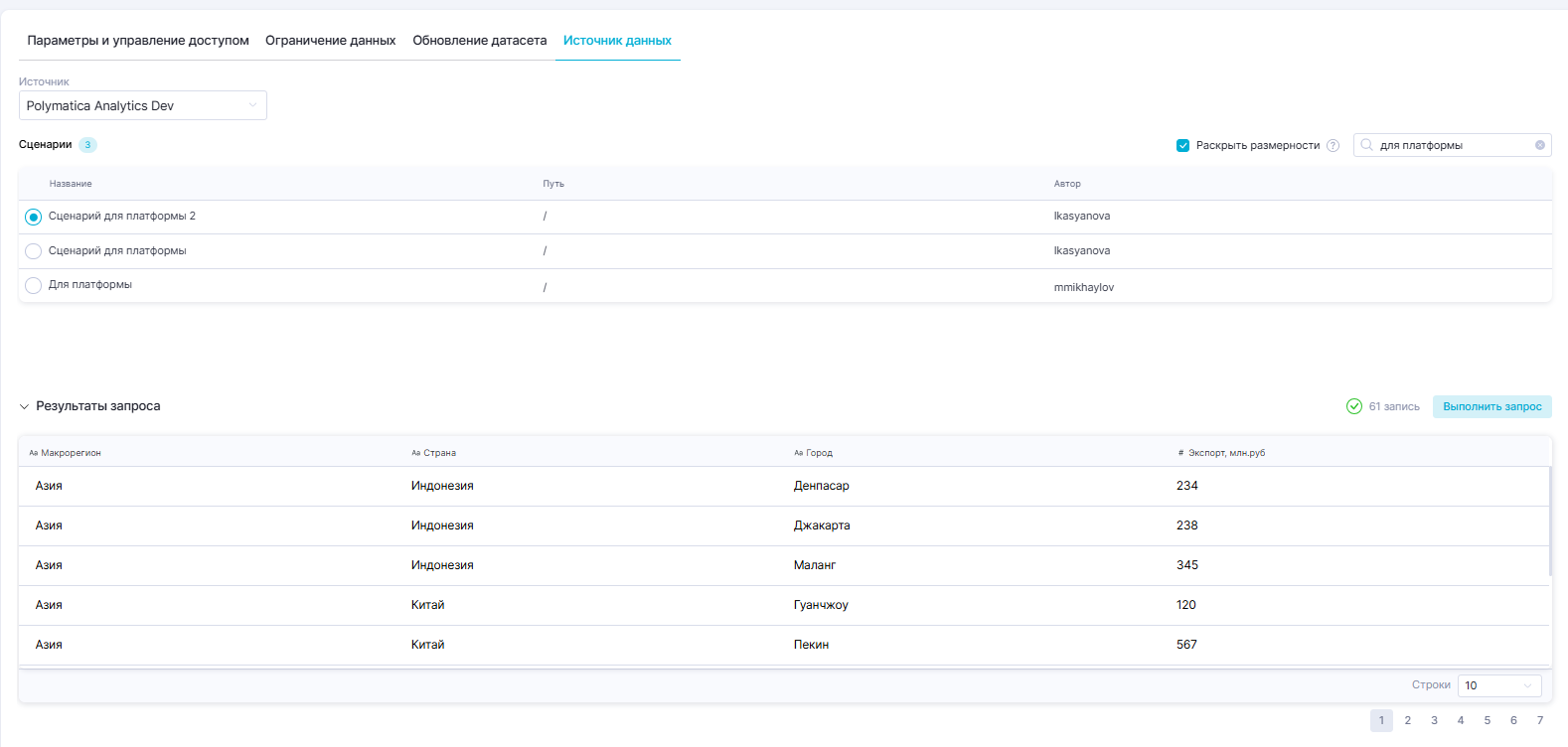 Источник данных заменен. Данные из другого сценария отображаются в поле "Результаты запроса"