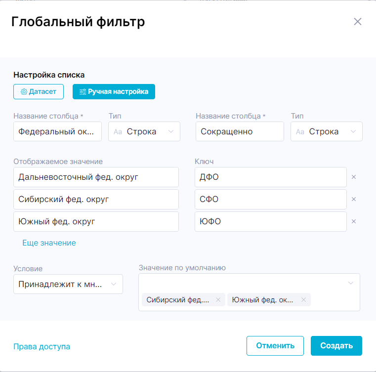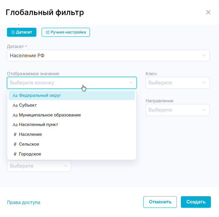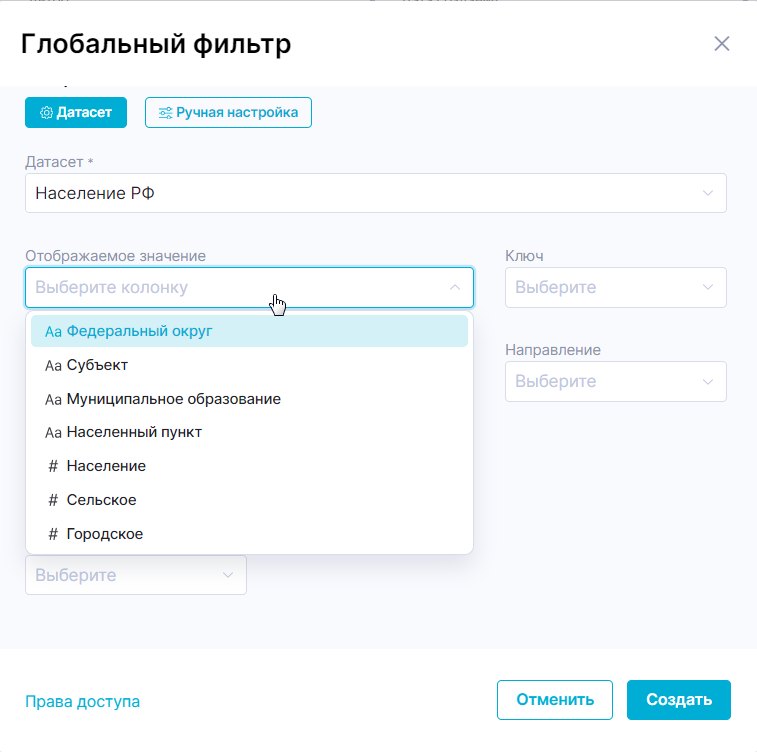 - Если в датасете одному отображаемому значению соответствует более одного ключа, то при выборе значения в условии фильтрации будет использован первый в порядке возрастания ключ. Например: если для отображаемых значений используется колонка «Федеральный округ», а для ключей колонка «Субъект», то при выборе значения «Приволжский федеральный округ» в условии фильтрации будет использовано значение «Кировская область».