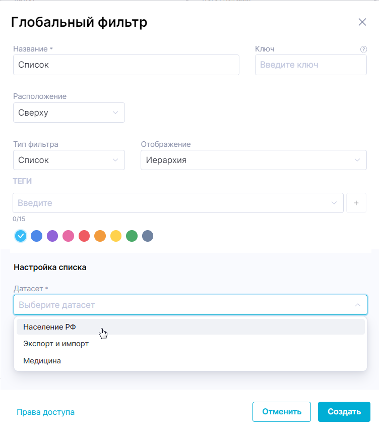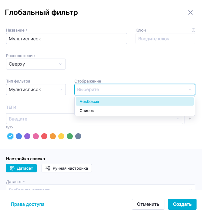 При смене отображения, настройка списка автоматически сбрасывается к способу определения набора значений «Датасет», а заполненные поля очищаются. Пожалуйста, выбирайте отображение заранее.