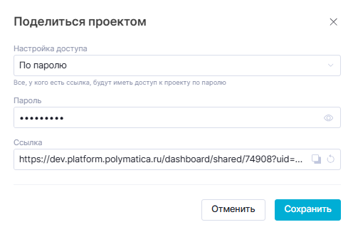 Возможность предоставления доступа к проекту по паролю, который необходимо будет ввести для доступа к проекту. При выборе данного типа доступа окно настроек предоставления доступа к проекту принимает следующий вид: