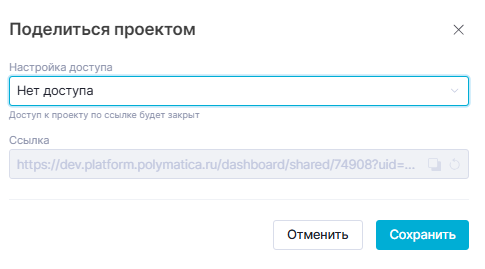 Данный функционал предоставляет возможность авторизованному пользователю поделиться проектами, к которым у основного пользователя есть доступ, с другими пользователями в виде предоставляемой ссылки.