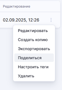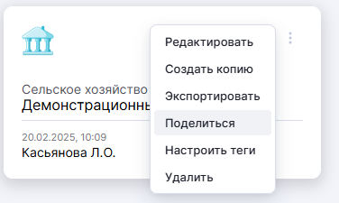Для того чтобы поделиться проектом, следует нажать на кнопку на карточке проекта при карточном представлении списка проектов и выбрать "Поделиться":