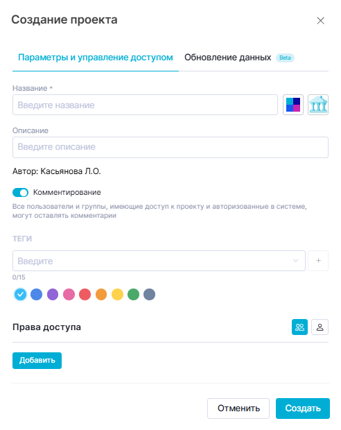 Для отмены внесенных данных в окно создания проекта следует нажать кнопку , расположенную в верхнем углу окна создания проекта, или нажать левую кнопку мыши вне области окна. Для сохранения внесенных данных следует нажать кнопку «Создать». Проект будет создан. Произойдет возврат в реестр проектов.