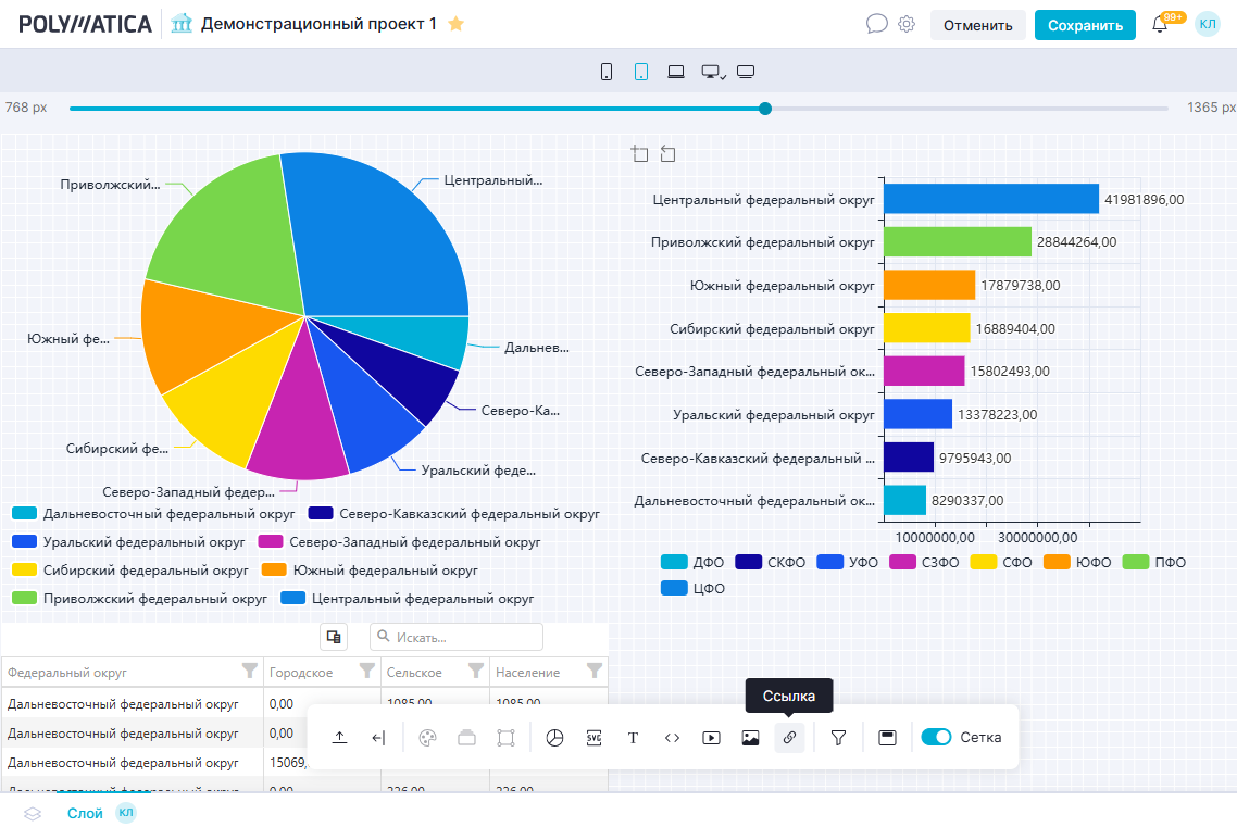 Ссылка представляет собой визуальный элемент в виде кнопки, которая будет добавлена на проект после создания. Нажимая на кнопку, пользователь сможет перейти во внешний источник информации (открывается в отдельной вкладке) или перейти, например, на другой слой данного проекта (в этом случае заданная ссылка будет открыта в текущей вкладке).