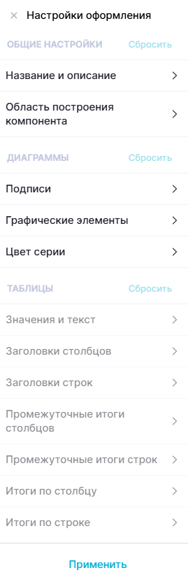- оформление таблицы – когда выбрано несколько таблиц, с учетом доступных настроек в зависимости от типов таблиц.