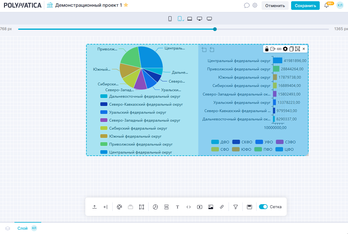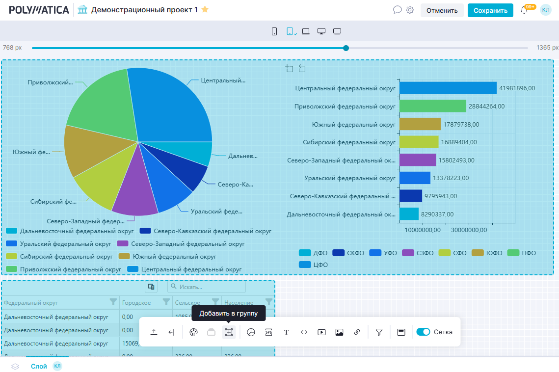 Чтобы сгруппировать компоненты, выберите на слое два или более компонента (нажмите на них с зажатой клавишей Shift) и кликните на плавающей панели редактирования проекта кнопку «Сгруппировать ». Кнопка становится активной, когда достаточное количество компонентов (минимум 2) выбрано.