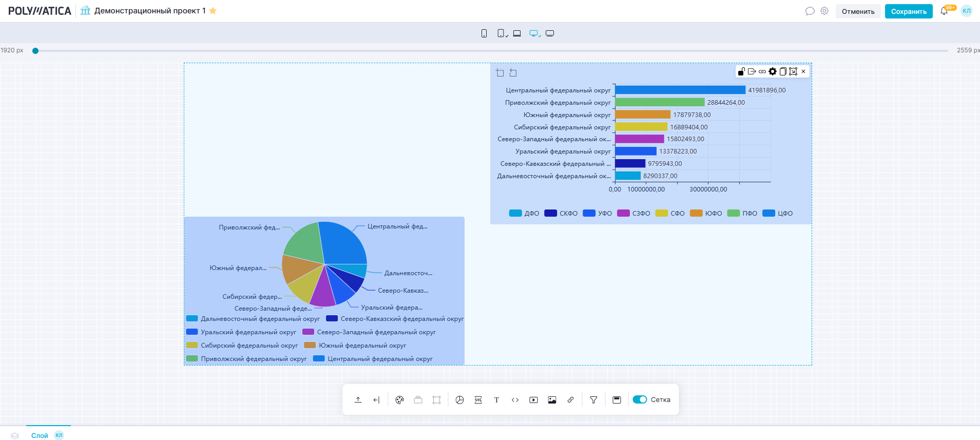 Также доступно индивидуальное изменение размеров и перемещение незаблокированных объектов внутри группы. Для перемещения/изменения размеров объект необходимо выделить, нажав на него. Выделенный объект доступен для перемещения и изменения размеров. При этом контейнер группы подстраивается под новые размеры и расположение компонентов.