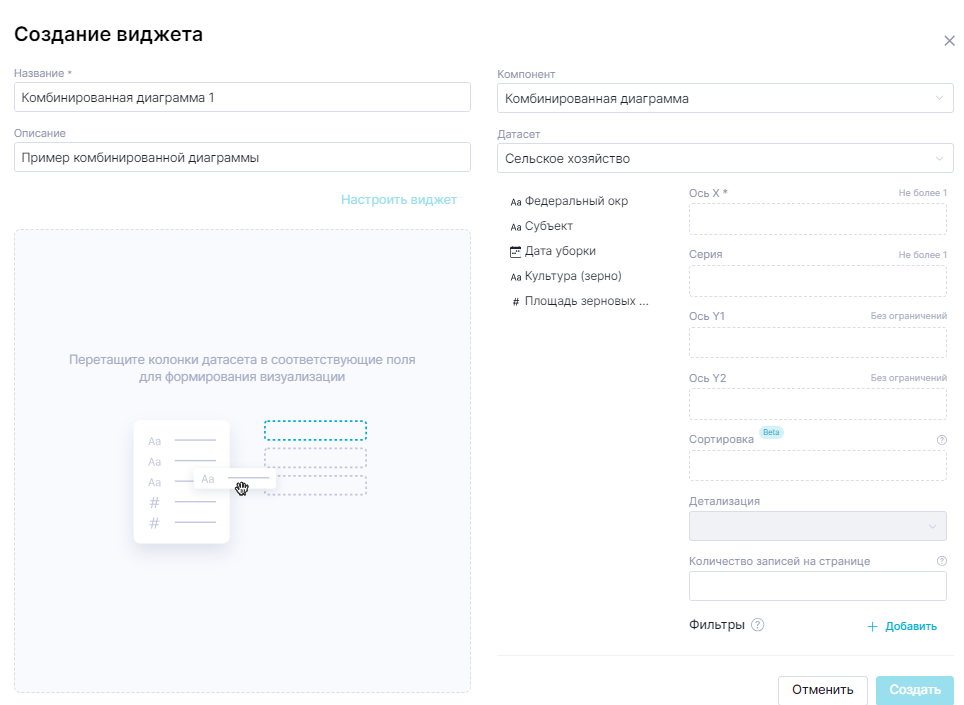 Когда датасет выбран, под полем «Набор данных» отображаются все колонки выбранного датасета. Колонки могут быть перетаскиванием вынесены в поля данных, чтобы формировать из значений колонок представление данных на виджете.