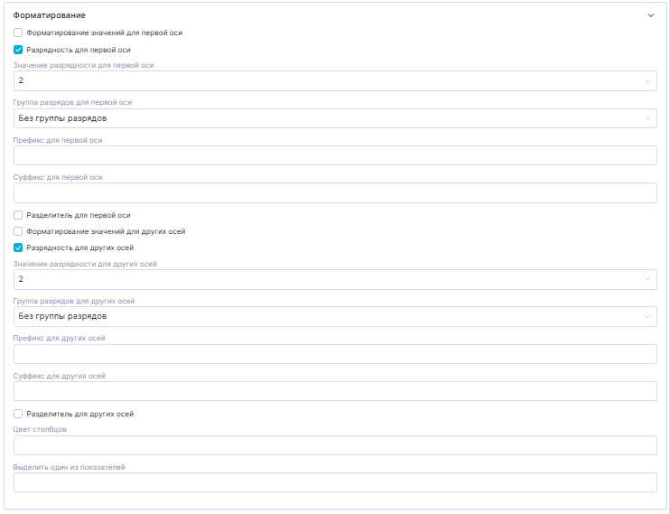 • Форматирование значений для первой оси/других осей – применение локального форматирования к отображаемым значениям на оси.