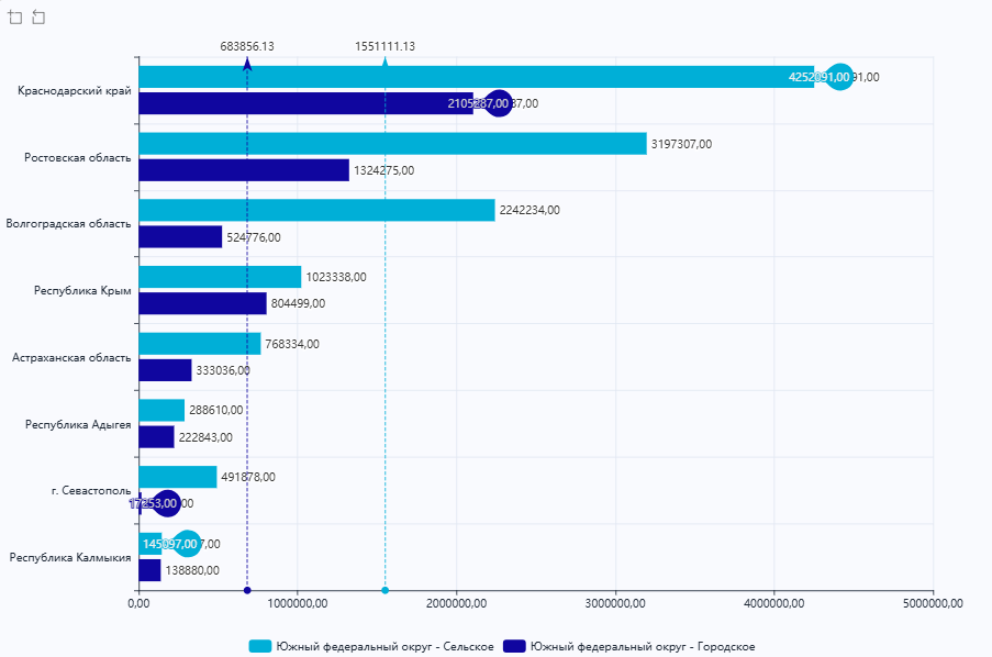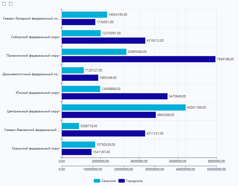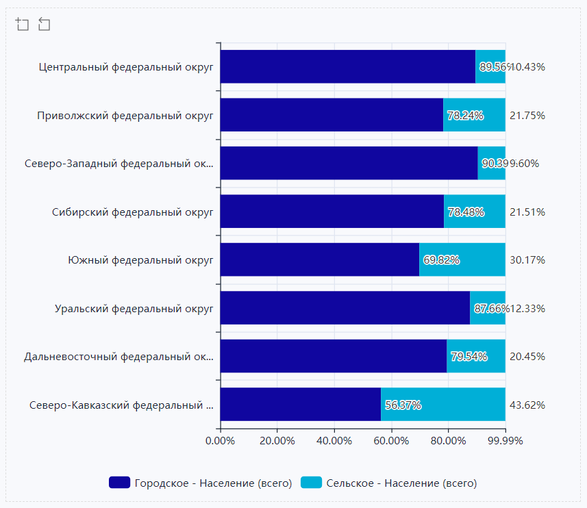 В поле «Ось X» вынесены три колонки - «Население», «Городское», «Сельское». Соответствующие показатели отображаются на диаграмме и в легенде. Для второго показателя отображается дополнительная ось. Показатель, на который наведен курсор, отображается ярче