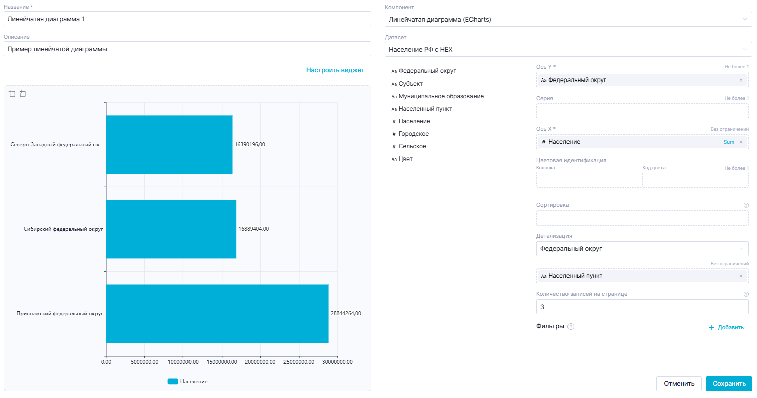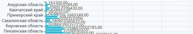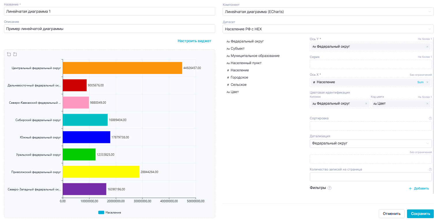 В блок вынесены колонки «Федеральный округ» и «Цвет». Линейки диаграммы окрасились в соответствующим федеральным округам цветам HEX