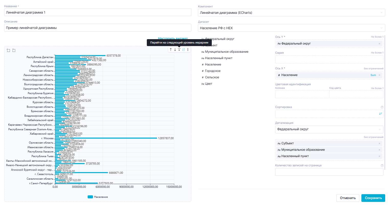 Вынесенные в поле колонки используются в детализации Drill-down. Первым слоем детализации автоматически становится колонка, вынесенная в поле «Ось Y». Нижележащие слои детализации формируются вынесенными колонками в поле «Детализация», в порядке их расположения сверху вниз, как если бы их выносили в поле «Ось Y».