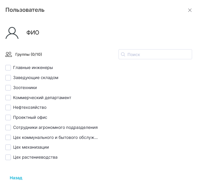 - Поиск. Для поиска группы пользователей следует ввести в поле искомое значение. Список ниже отфильтруется относительно искомого значения. Введенное значение исчезает из поля при нажатии на кнопку ;
