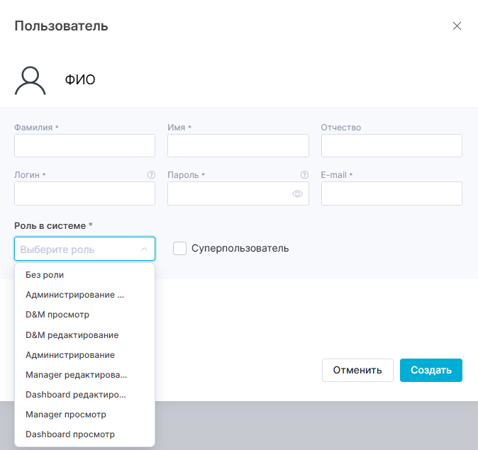 Для выбора роли пользователя в системе необходимо нажать на выпадающий список «Роль в системе» и выбрать соответствующее значение.