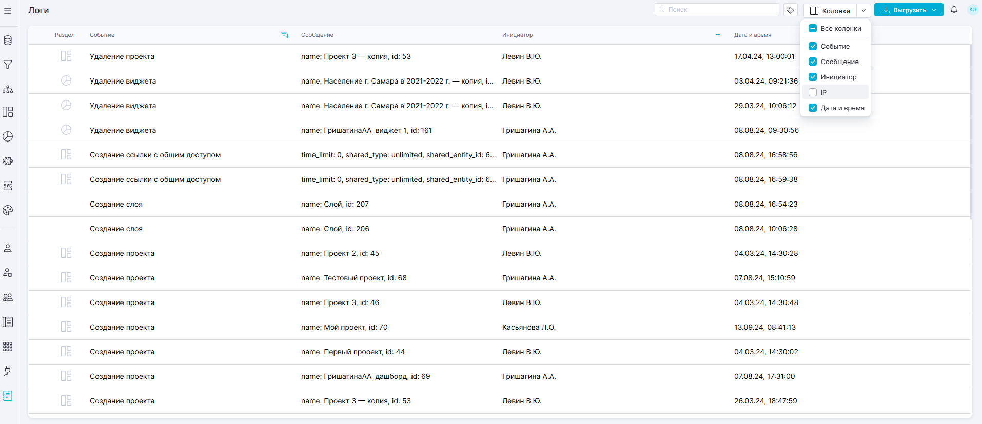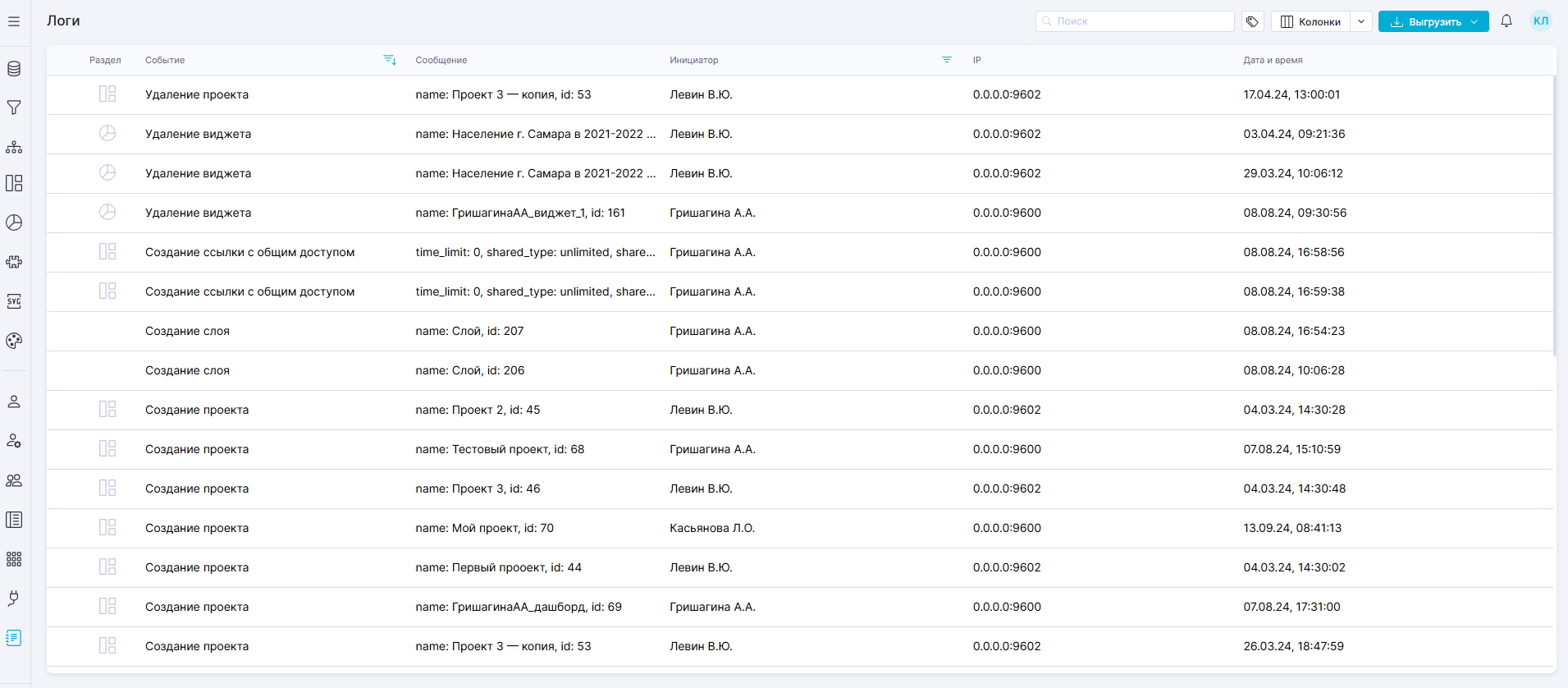 Кнопка "Выгрузить" над реестром логов раскрывается в меню, позволяющее скачать в формате ZIP: