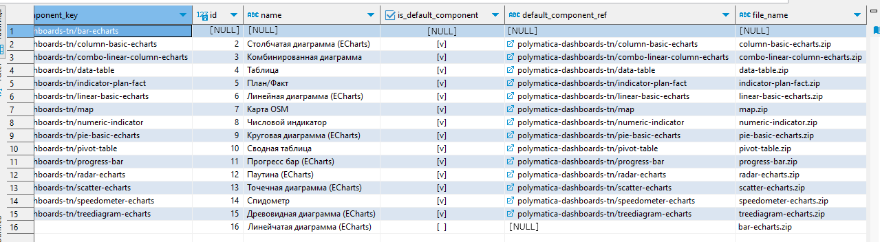 Если какой-либо из базовых компонентов не установлен в приложении, то для значения ключа такого компонента из колонки default_component_key будут отсутствовать значения (NULL) в остальных колонках, а для установленных пользовательских компонентов, наоборот, будут отсутствовать значения в колонке default_component_key. Например:Компонент с типом bar-echarts (строка 1) не установлен, а компонент с ID = 16 (строка 16) пользовательский