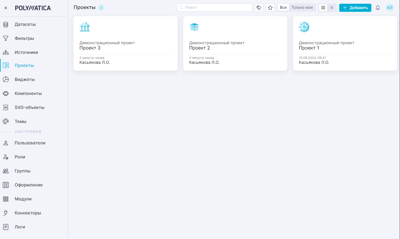 Раздел «Проекты» предназначен для добавления проектов, а также просмотра, редактирования и удаления существующих доступных проектов.